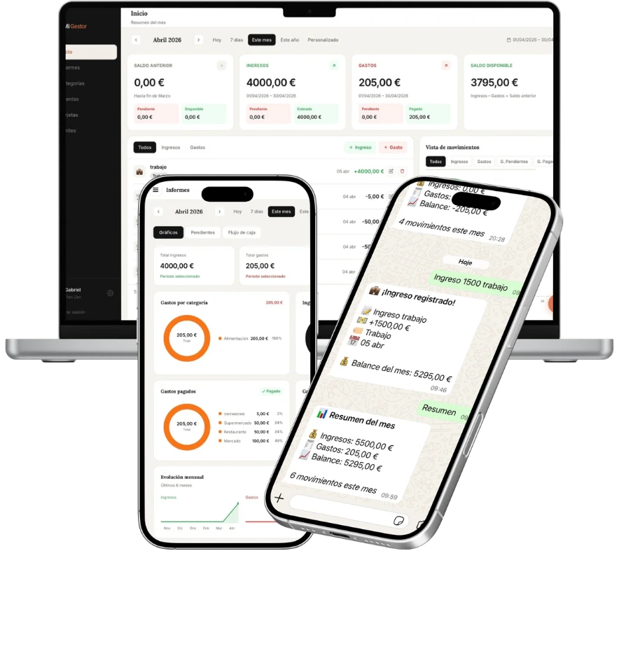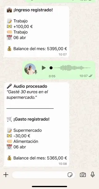 Registra gastos e ingresos directamente desde WhatsApp, sin abrir ninguna otra app.